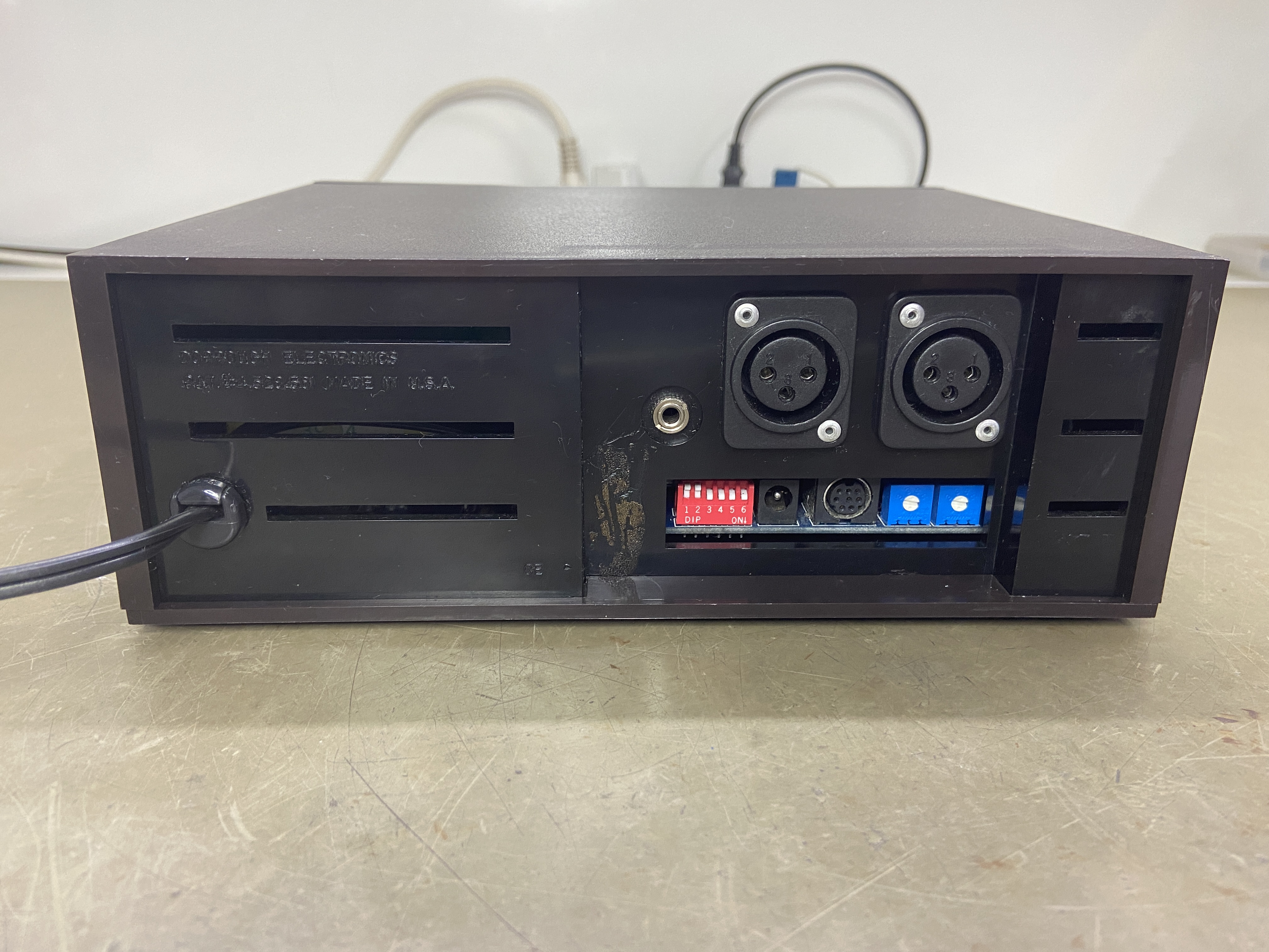 Par de monitores de intensidade Dorrough 40-A. Ambos apresentavam falha ao ligar, e não efetuavam medidas.
